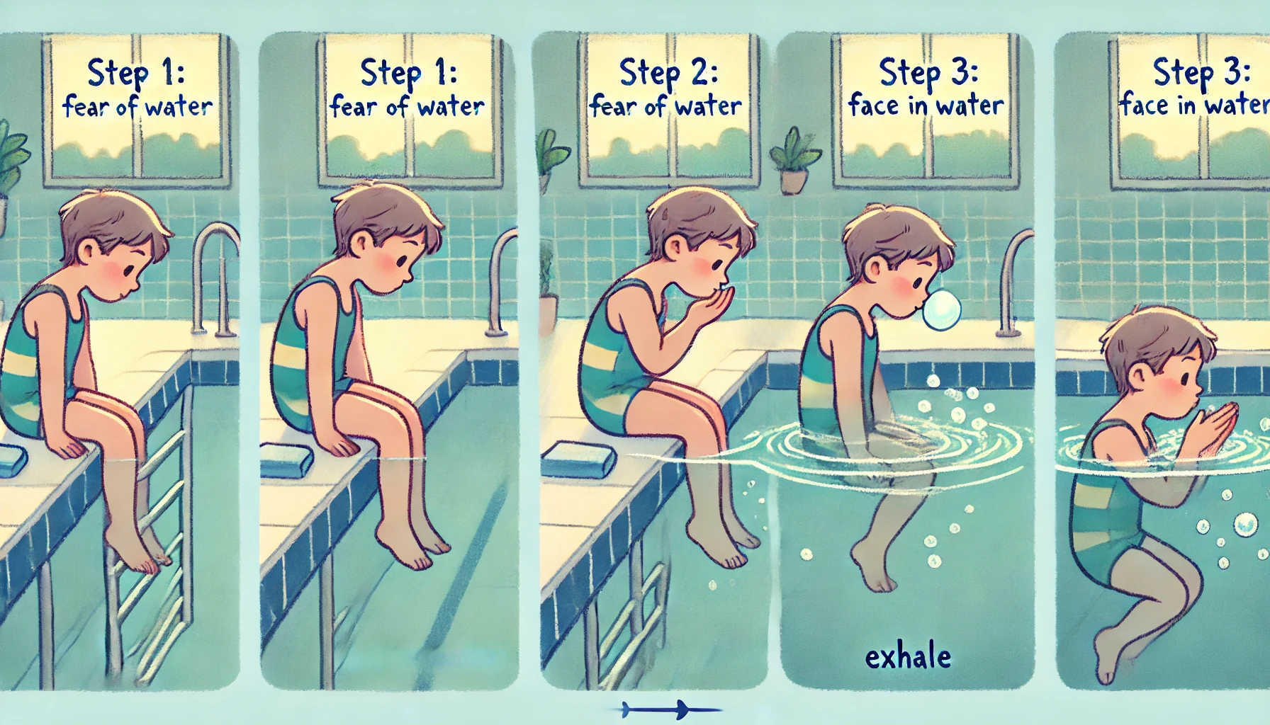 TIP: 얼굴을 물에 담글 때는 코로 깊게 숨을 들이마신 뒤, 입으로 천천히 “후~” 하고 내쉬는 연습이 가장 중요해요. 이 과정에서 물속에서의 ‘긴장’을 풀고, 몸이 물과 친해지는 감각을 익히게 됩니다.