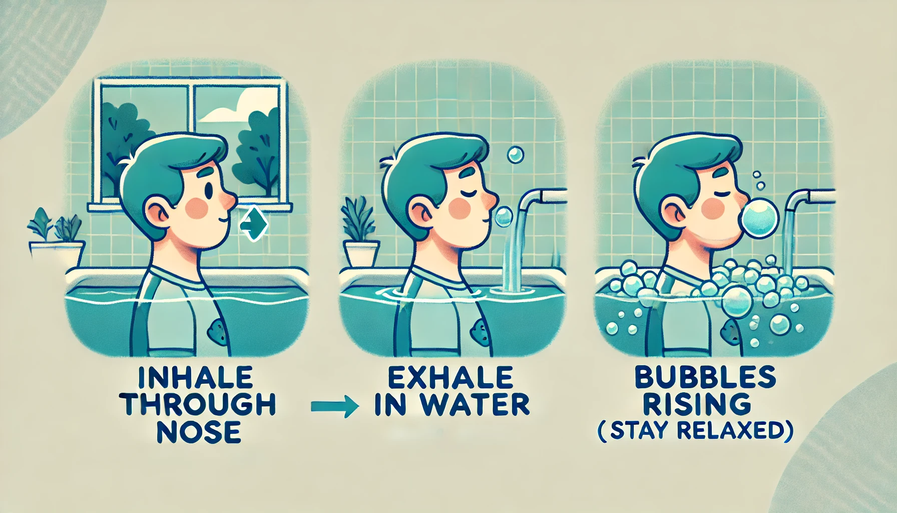 - 욕조나 세면대에서 얼굴을 담그고, 물방울이 올라오도록 내쉬는 연습을 반복