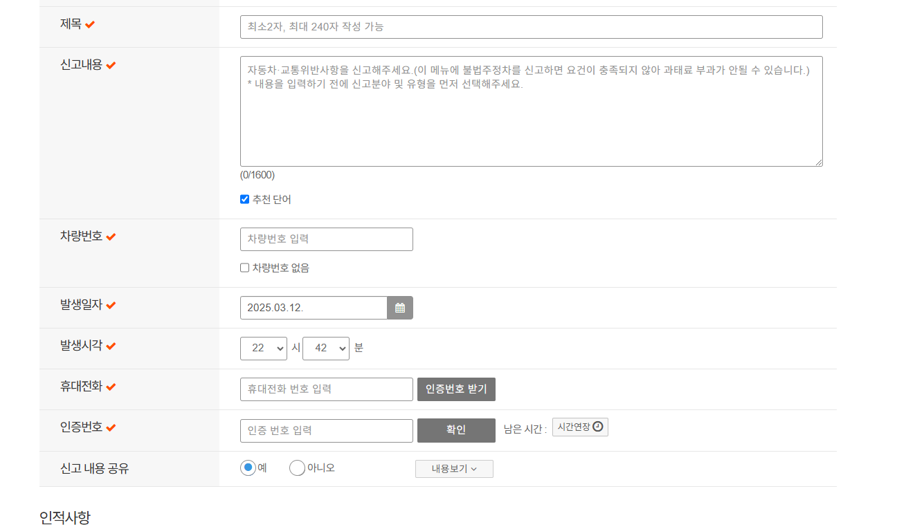- 예시: "2025년 3월 12일 오후 2시 30분, 서울 강남역 사거리에서 신호위반 차량 목격 (차량번호: 12가 3456)"